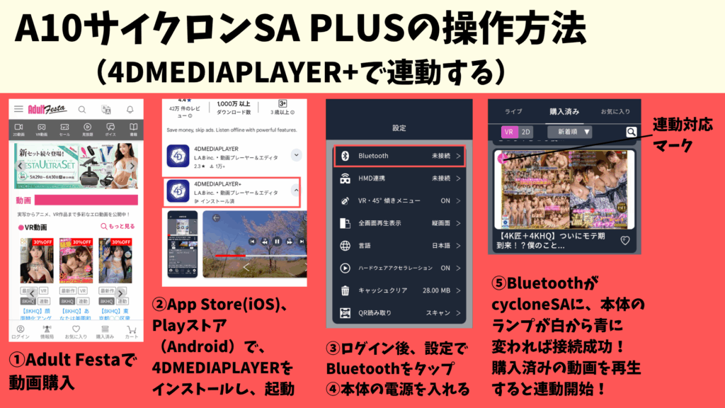 連動のさせ方は色々ありますが、今回は最も簡単に連動させる方法としてアダルトフェスタで購入した動画をスマホで再生しながらA10サイクロンSA+PLUSを連動させる方法を紹介します。