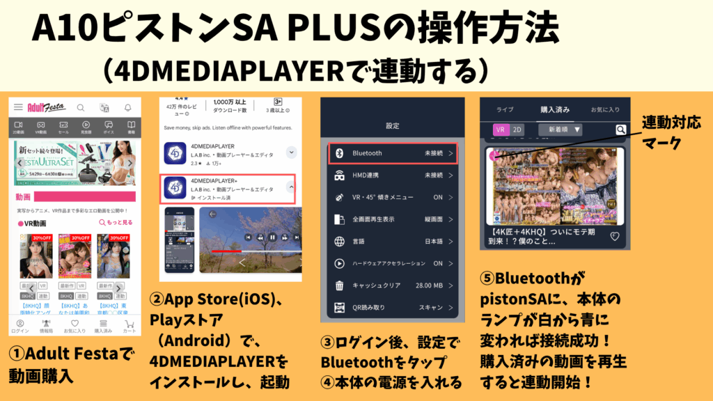 連動のさせ方は色々ありますが、今回は最も簡単に連動させる方法としてAdult Festa(アダルトフェスタ)で動画した動画をスマホで再生しながらA10ピストンSA+PLUSを連動させる方法を紹介します。