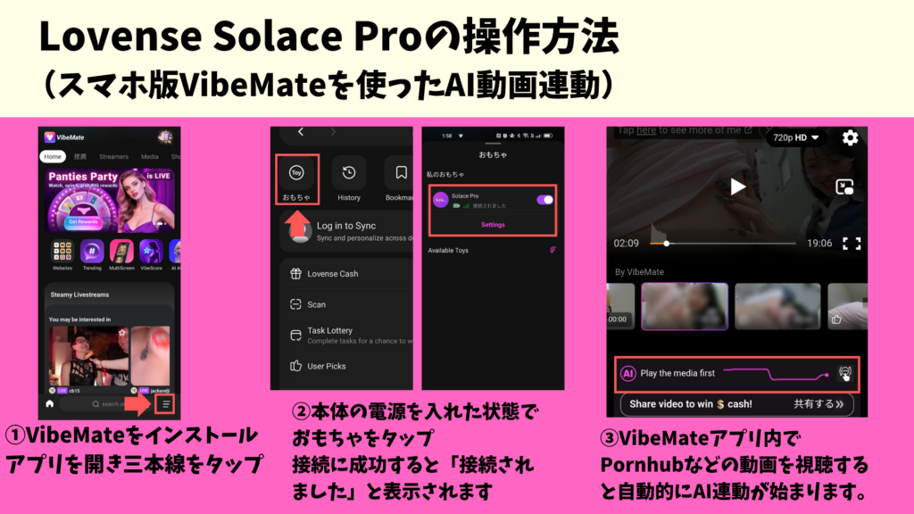 そこで当記事では購入したばかりの方向けにLovense Solace Proの基本の使い方と、AI連動アプリ「VibeMate」を使ったAI動画連動の方法を紹介します。