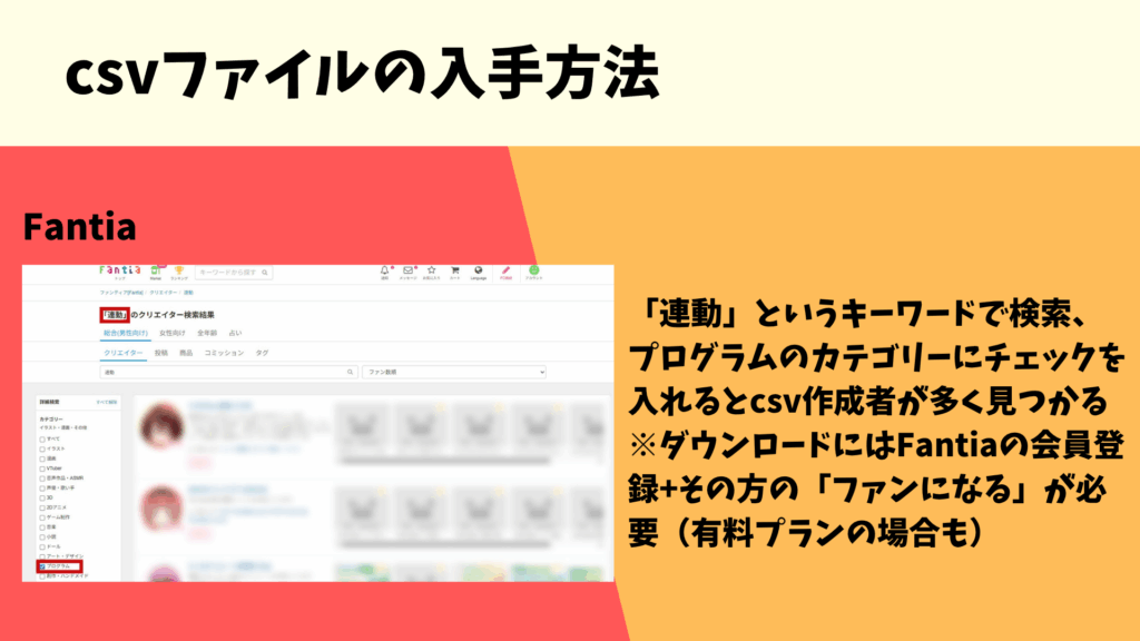 csvファイルのダウンロードには、ファンティアのアカウント登録と、作っている方の「ファンになる」ことが必須です。